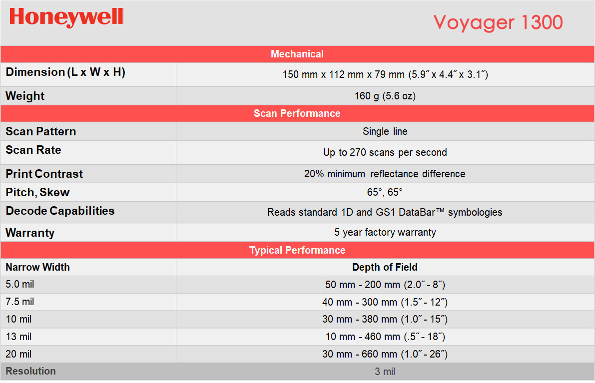 It designed to keep your operation running smoothly, the Hyperion 1300g is durable enough to hammer nails. The Hyperion 1300g is the ideal choice for customers who value aggressive scan performance and durability in a general duty handheld linear scanner. Honeywell Voyager 1300g Scanner Specification