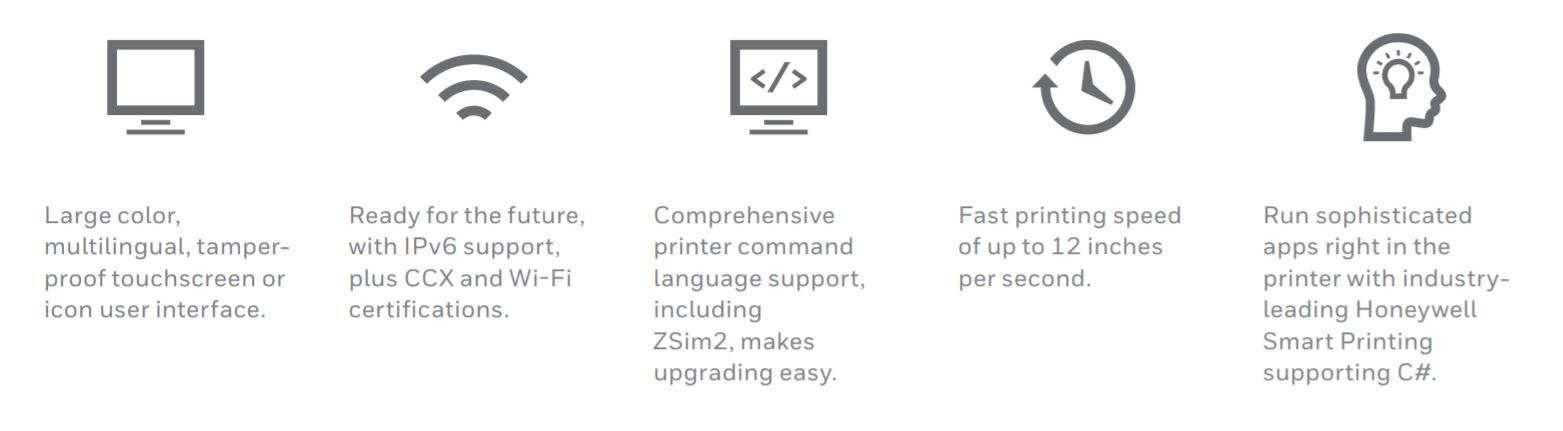 Built to deliver maximum uptime, PM Series printers are available with either a tamper-proof color touchscreen in 10 languages, or a universal icon interface. It has an integrated web interface that allows for easy setup, monitoring and configuration through devices like handheld computers, tablets or smartphones. Honeywell PM43 Specification