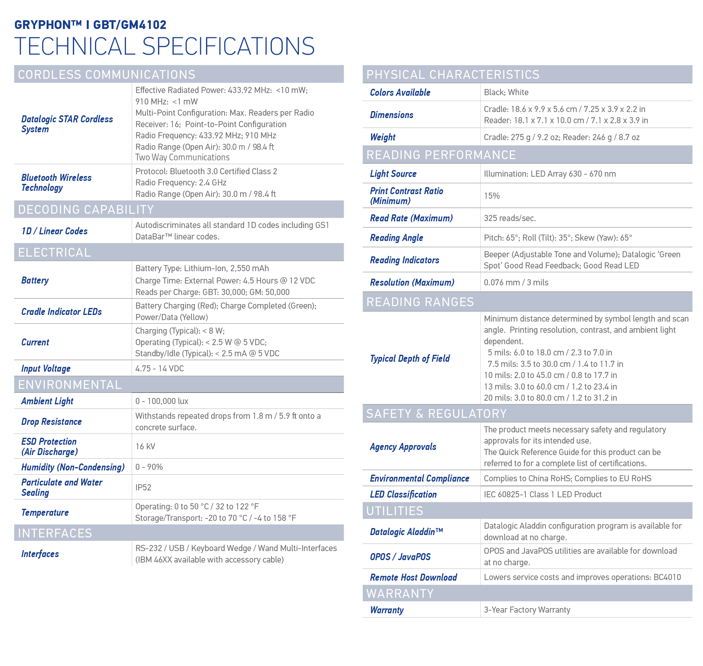 Datalogic GBT4102 Cordless Barcode Scanner Specification
