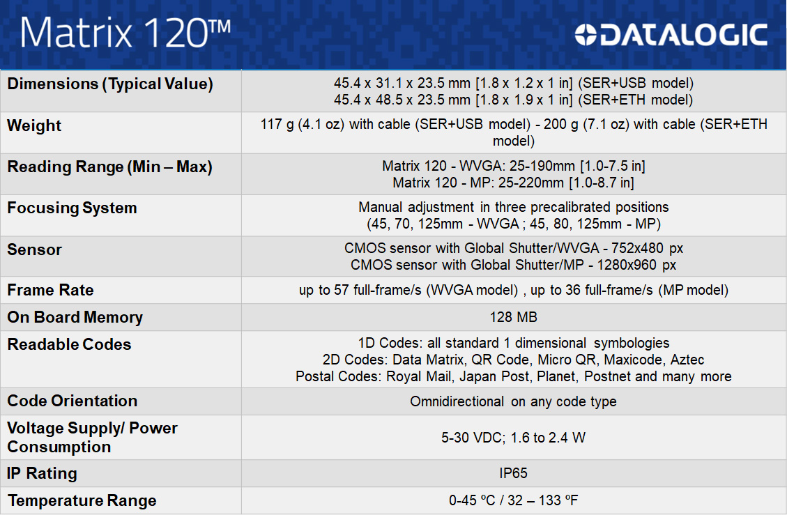 industrial grade in its class; multiple models of the Matrix 120 imager allow it to