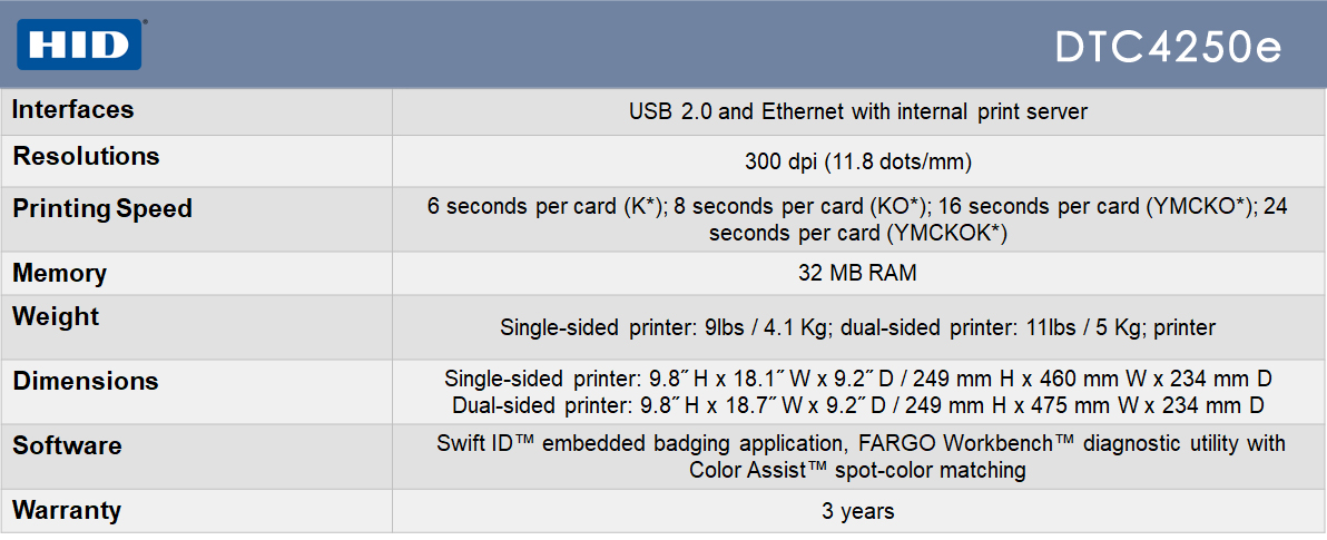 HID® Fargo® DTC4250e Specification![]() HID® Fargo® DTC4250e Features