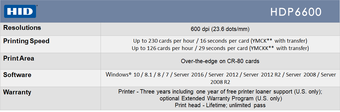 The FARGO HDP6600 from HID Global is ideal for organizations of any size that need retransfer printing technology to routinely issue secure and durable, high definition IDs or cards at high speeds. As a cost-effective, eco-friendly and reliable solution, the HDP6600 provides high resolution 600 dpi printing capability for superior text and image quality.