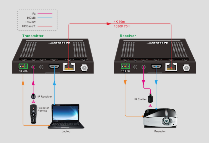 The KanexPro EXT-HDBT70M is an UltraSlim, HDCP 2.2 compliant extender set consisting of a transmitter and receiver. It uses HDBaseT technology to transmit uncompressed, high-resolution 1080p/ 4K signals from transmitter to the receiver via a CAT5e/CAT6a cable at a distance of up to 70/40m. It supports 4K/60Hz with 4:2:0. Moreover, the extender set supports CEC, bi- directional RS232 & IR control, and bi-directional PoH (power over HDBaseT) function.